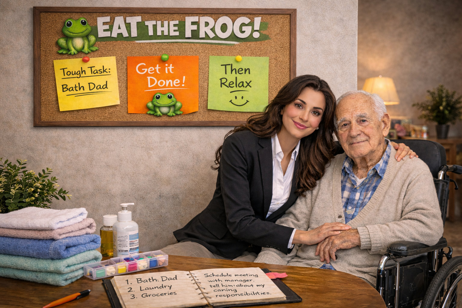 “Eat the Frog” is a productivity concept that means tackling your most important or most difficult task first, rather than putting it off. The idea is that if you start the day by completing the task you are most likely to avoid, everything else feels easier and less stressful afterward. By dealing with the hardest responsibility early, you reduce mental load, gain a sense of control, and create momentum for the rest of the day, which is especially helpful when juggling demanding roles like caregiving, work, and personal life